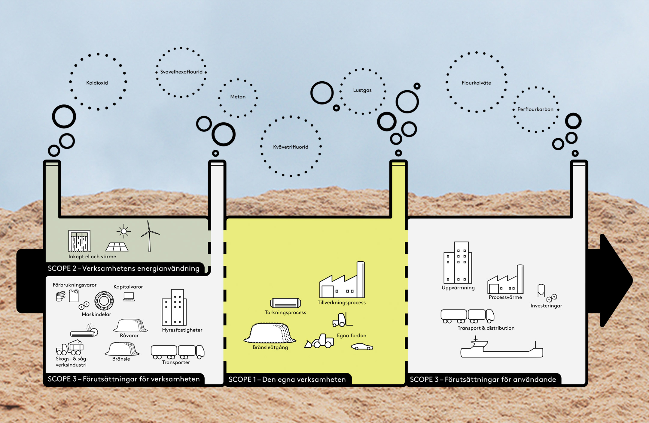 För att kunna mäta klimatåtgärder på ett standardiserat sätt och därmed kunna jämföra sig med andra, både inom och utanför den egna branschen, är det nödvändigt att göra tydliga avgränsningar. Du har säkert stött på begreppet ”Scope” i samband med att företag pratar om utsläpp. Det är ett begrepp som har sitt ursprung i Science Based Target initiative (SBTi), där utsläpp delas in i tre områden s.k. Scope.