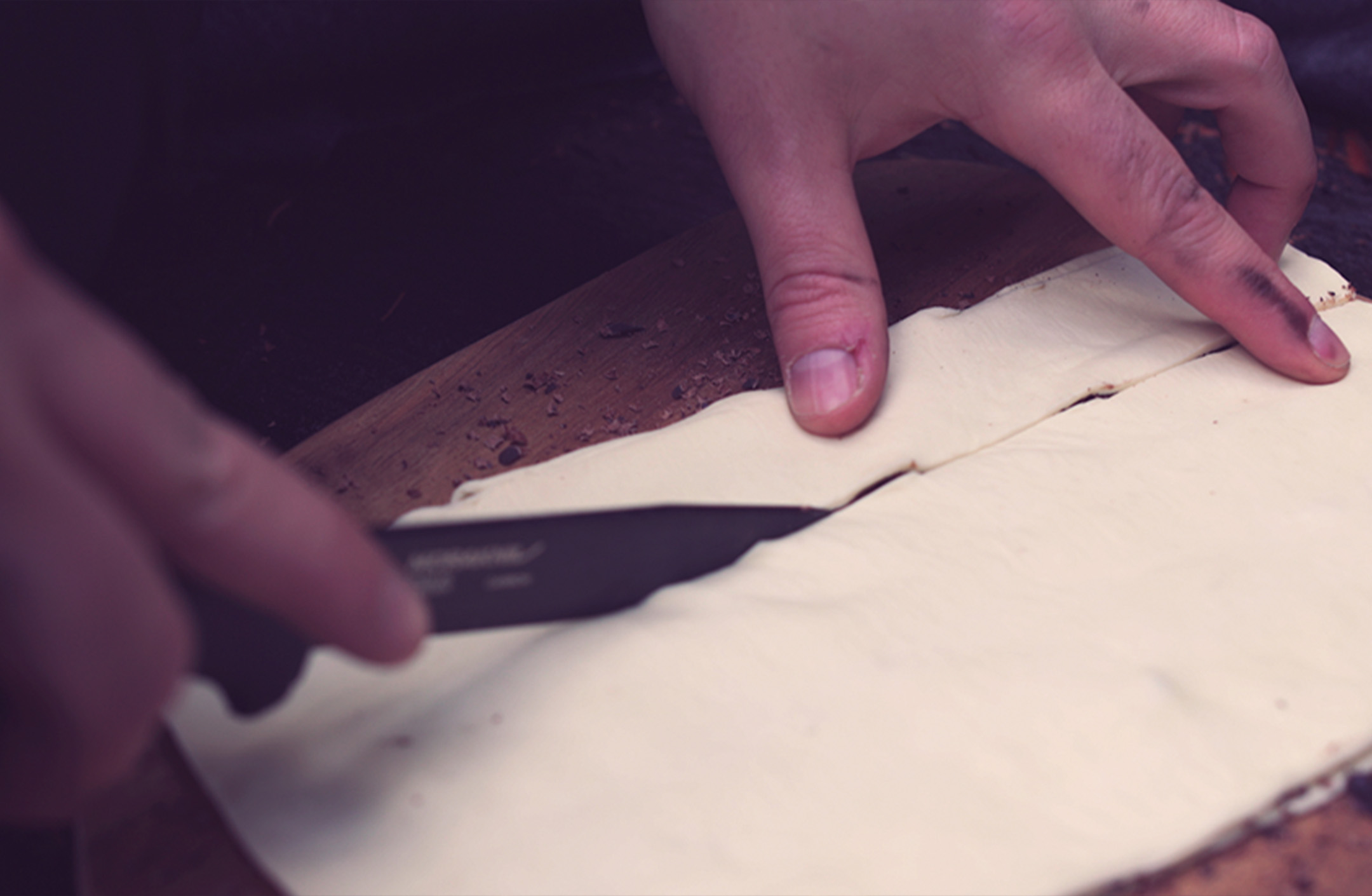 Lägg ett andra smördegsark över den rivna chokladen och skär sedan degen i remsor.