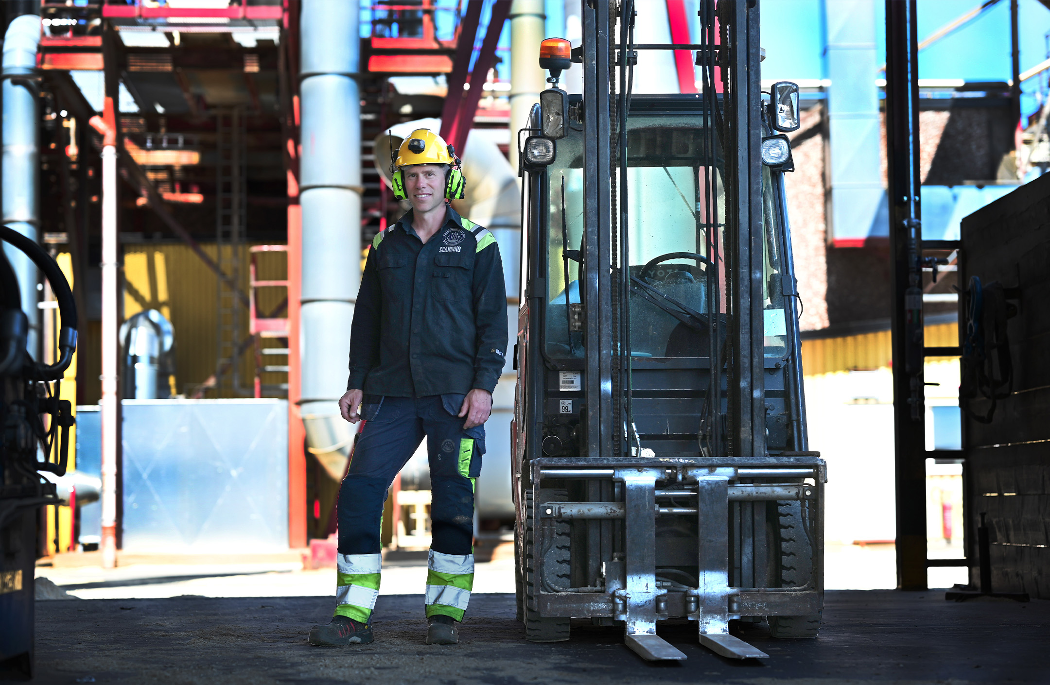 Jag och mina skiftkollegor ansvarar för att pelletstillverkningen är igång 24/7. Vi kontrollerar processen och löser de problem som uppstår. Men det blir även en del tid i hjullastaren när jag tar emot råvara, matar på med material in i processen och ser till att vi kan leverera ut färdig produkt. Utöver det ingår bland annat provtagning i mina arbetsuppgifter. Processen ska ju inte bara snurra på, vi ska leverera en hög och jämn kvalitet också.